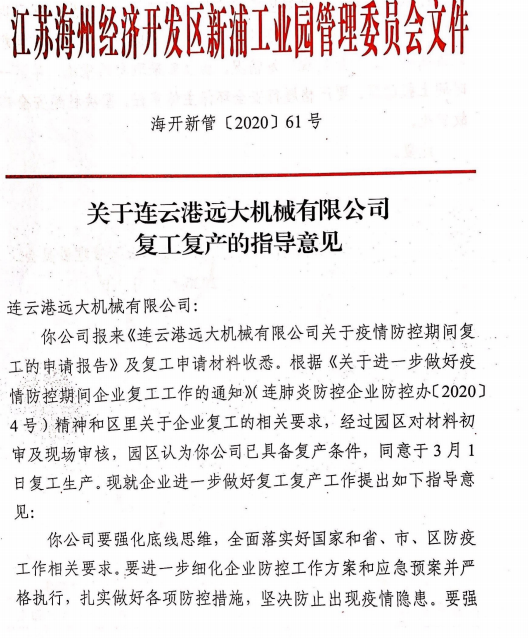 在前期的精心準(zhǔn)備下,我公司已于3月1日通過疫情防控、安全生產(chǎn)、環(huán)保生產(chǎn)三項(xiàng)驗(yàn)收,3月2日獲得復(fù)工批文并于今日正式復(fù)工。公司將強(qiáng)化底線思維,全面落實(shí)好國家和省、市、區(qū)防疫工作的相關(guān)要求。在扎實(shí)做好各項(xiàng)防控措施的基礎(chǔ)上,堅(jiān)決杜絕疫情的發(fā)生。