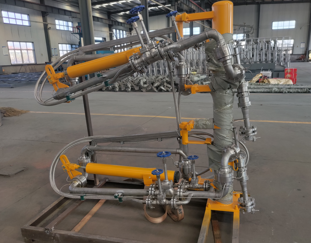 LNG、乙烯裝卸車臂的主要功能用于在罐車和管線間建立通道,完成主要的裝卸車功能;另外與回收裝置相聯(lián),用于平衡罐車內(nèi)壓力。低溫裝車臂主要分為氣相和液相兩條臂,兩條臂共同裝在一個立柱上。實現(xiàn)低溫介質(zhì)的裝卸車和回氣補氣,每個獨立的裝卸臂分為內(nèi)臂、外臂及和槽車連接的前部外伸臂。在裝卸臂的外臂上一般設立用于主管線關斷的球閥及在兩邊用于氮氣置換的旁路球閥,外臂有一彈簧平衡系統(tǒng)用來平衡外臂、外伸臂的重量,便于操作裝車。